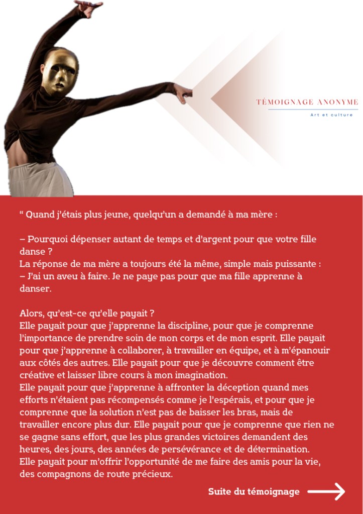 Ces valeurs ne sont pas que des mots : elles se vivent au quotidien, comme l’illustre le parcours de ceux qui ont grandi avec la danse. Voici le témoignage émouvant d’une ancienne élève, qui nous rappelle que chaque pas, chaque effort et chaque instant passé à danser construit bien plus qu’une technique : il forge une personne.
